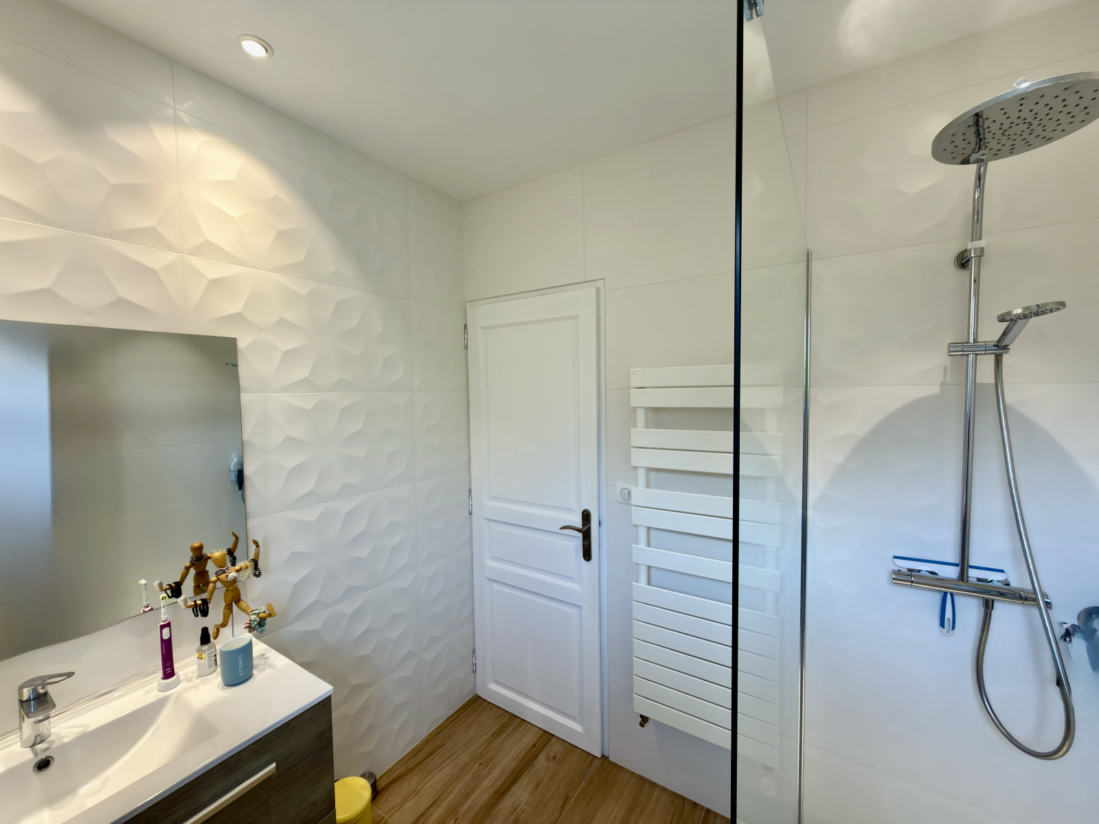 Côté prestations : fibre optique, adoucisseur d’eau, raccordement au tout-à-l’égout et équipements domotiques (portail, volets roulants, chauffage, éclairage, porte de garage motorisée).